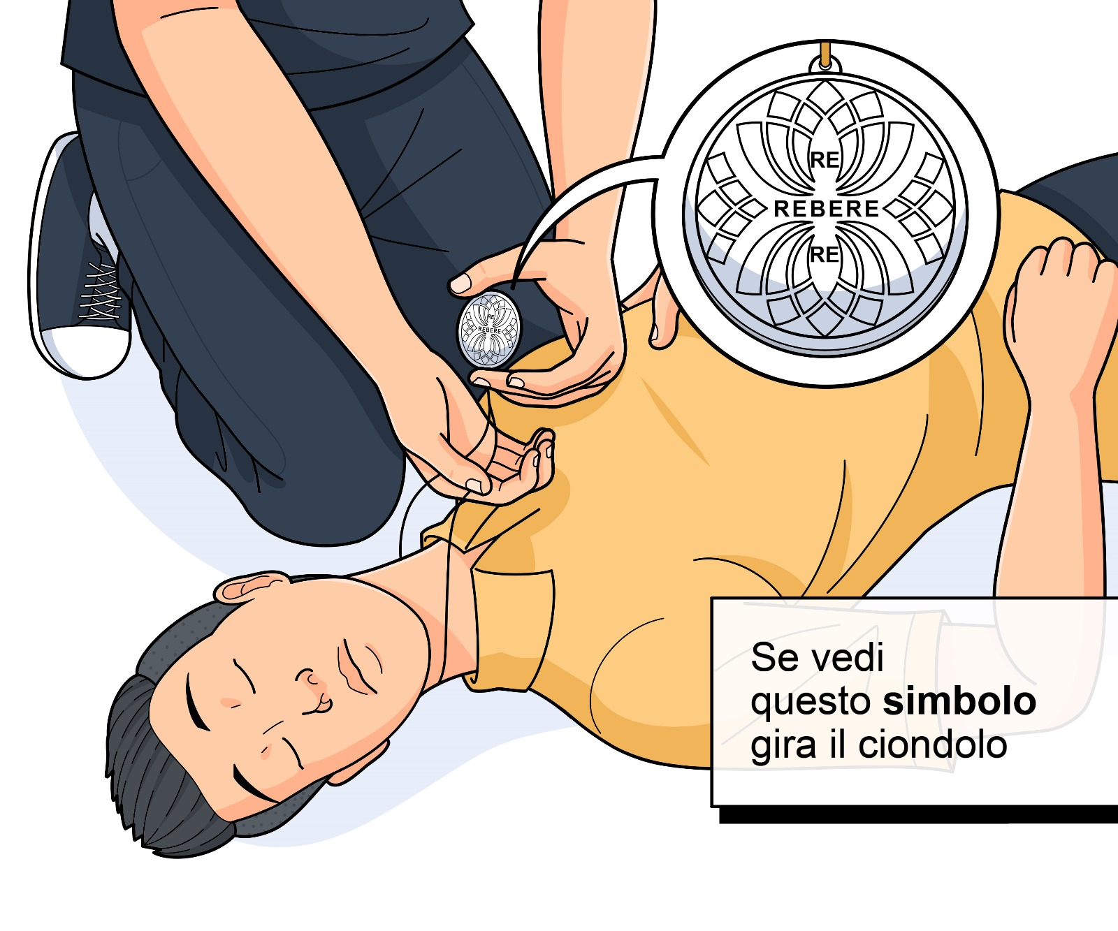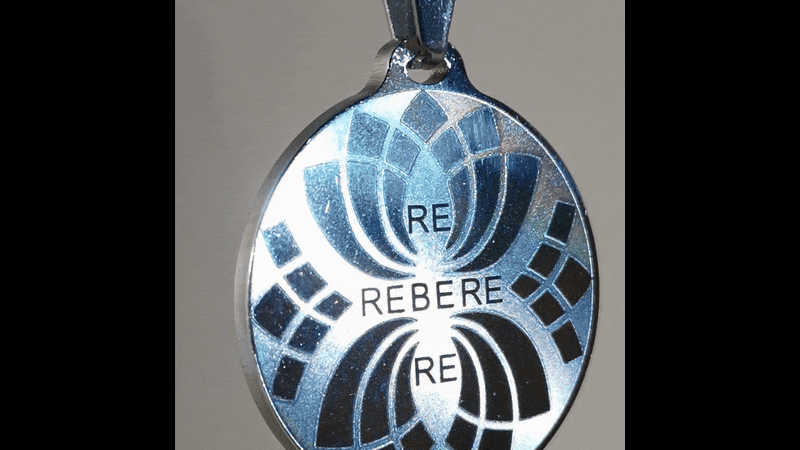 Gli abbonati al servizio REBERE ricevono un ciondolo in acciaio inox con sul davanti in marchio REBERE rappresentante un fiore di loto stilizzato con le due scritte REBERE incrociate fra loro e sul retro, in modo discreto e riservato, vi è inciso un QR-CODE univoco e personale.