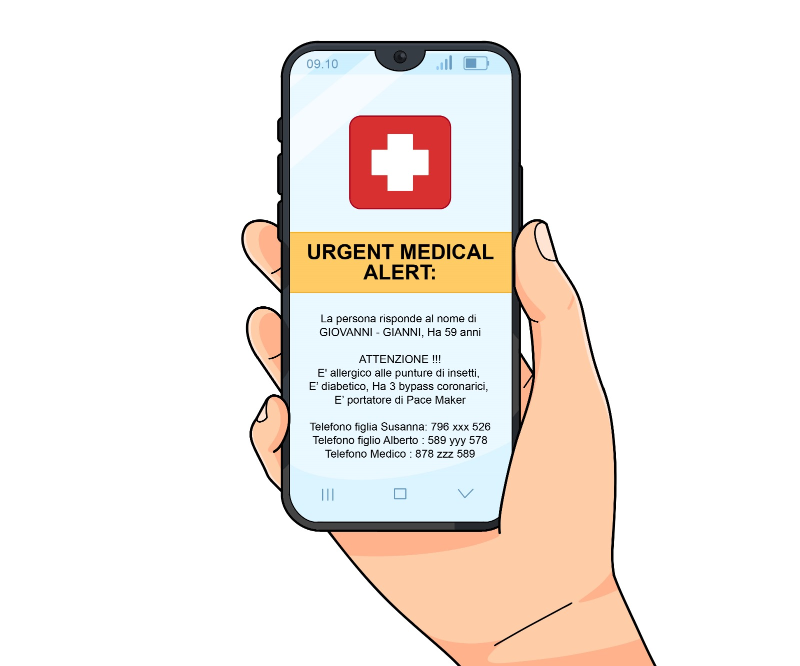 Fa conoscere a chiunque ti soccorra tramite un qualsiasi smartphone le tue patologie particolari e contemporaneamente avverte i tuoi cari.